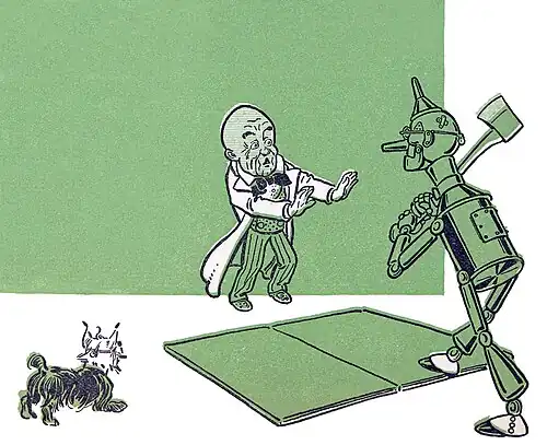 The Lion thought it might be as well to frighten the Wizard, so he gave a large, loud roar, which was so fierce and dreadful that Toto jumped away from him in alarm and tipped over the screen that stood in a corner. As it fell with a crash they looked that way, and the next moment all of them were filled with wonder. For they saw, standing in just the spot the screen had hidden, a little, old man, with a bald head and a wrinkled face, who seemed to be as much surprised as they were. The Tin Woodman, raising his axe, rushed toward the little man and cried out,