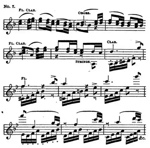 It begins with a legato phrase, in three members of two bars each, divided between the Flutes, Oboes, and Clarinets, and continues with bolder phrases, also distributed between the various members of the Wind band (not altogether unlike the second subject in the first Allegro of the Eroica), while to the latter portion the Strings maintain an interesting accompaniment in semiquaver arpeggios. An in-