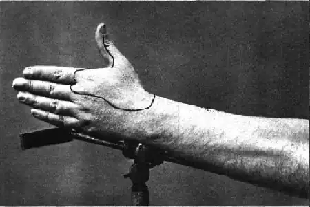 By December 3 (222 days after the operation), the peculiar tingling sensation produced by cotton wool could be .evoked by stimulating the thumb and the adjoining interosseous space. This sensibility rapidly increased in extent, until there was scarcely any part of the affected area from which it could not be produced (December 6). The sensation was one which could be expressed only as a general state of diffuse painless tingling. Moreover, it was found that parts which gave this reaction to cotton wool were insensitive to No. 5 of von Prey's hairs and to the painless interrupted curi'ent, just as in the early days after the operation. Exactly the same borders could be marked out both on the forearm and hand by dragging a pin lightly from normal to abnormal parts; for as soon as the old border of cutaneous anaesthesia to touch was passed, the sensation became a widely diffused tingling pain.