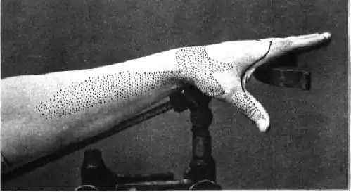 operation, was not the equivalent of the normal sensation of light touch over hairless parts, but was a peculiar form of hair-sensibility. For the areas endowed with it remained anaesthetic to the painless interrupted current and to No. 5 of von Frey's hairs; moreover, the sensation produced was widely diffused and was referred to remote parts, exactly like the sensation of prick and ice-cold over the same regions. This hypothesis was found at a later date to be correct. For on shaving the areas endowed with this form of sensibility, they became entirely insensitive to cotton wool.