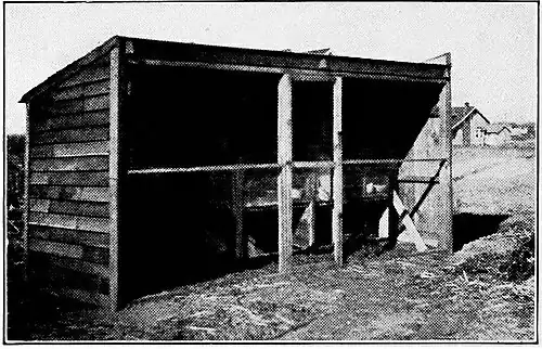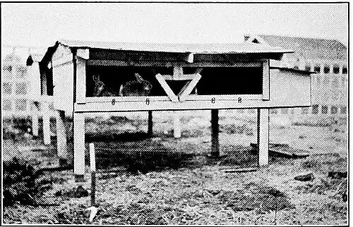 Contains nine hutches. Plan may be adapted to any open shed or barn.