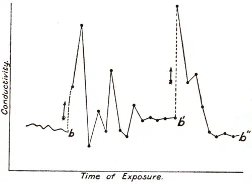 (fig. 31) it is seen that the reaction of a negative substance is in every respect opposite to that of a positive substance. It will be noticed that in confirmation of theory, heating or tapping produces restoration of sensitiveness in the first class by an increase, and in the second by a decrease of resistance. I have been able to verify this deduction by observations with nearly a dozen different substances, and have not, so far, come across any to contradict it. It thus appears that tapping restores the sensitiveness not by the separation of the electrically-welded particles (in which case tapping ought to have produced an increase of resistance in both the classes of fatigued substance), but by removing the strain in B and thus converting it into A.