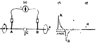 Quantitative stimulation is applied by producing a sudden torsional vibration, say of 90°, to the end A, with the result of an up-response of the galvanometer; on application of similar stimulus to the end B, there