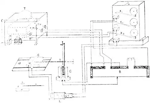 The selenium cell, S is periodically exposed to light by the electromagnetic shutter, T. The selenium cell forms one arm of the Wheatstone Bridge, B. The three keys, K₁, K₂, K₃, are periodically closed and opened by clockwork. G, the recording galvanometer with index, I, carrying double-pointed platinum at its end, which moves between the metal strip, C, and the plate, M. R, sparking coil with its electrodes connected with C and M. The battery is not shown in the figure (see text).