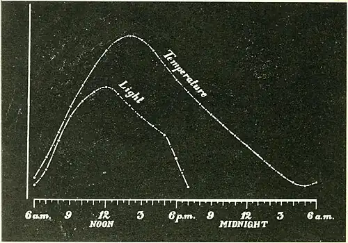 An important point arises as regards the diurnal variation of light and of temperature, and determination of their periods of maximum and minimum. For this purpose records of diurnal variations of temperature and of light were taken on the same day in summer with the
