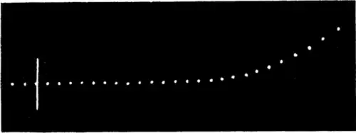 was tuned to vibrate 200 times in a second, and the interval between successive dots therefore represents 1/200 of a second. It is not difficult to measure one-fifth of the distance between successive dots, and calculation can therefore be carried into thousandths of a second. In the present case there are 15.2 spaces between the stimulus and the initiation of response. The latent period of the specimen is therefore 0.076 of a second. The average value of the latent period of the pulvinus of Mimosa is found to be 0.1 second.