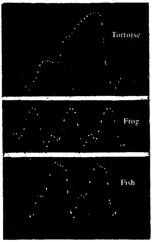 Fig. 121. Characteristic cardiograms of tortoise, frog and fish. The successive dot-intervals represent 0.05 sec.