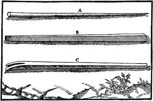The iron crowbars are likewise of two kinds, and each kind is pointed at one end. One is rounded, and with this they pierce to a shaft full of water when a tunnel reaches to it; the other is flat, and with this they knock out of the stopes on to the floor, the rocks which have been softened by the fire, and which cannot be dislodged by the pike. A miner's pike, like a sailor's, is a long rod having an iron head.