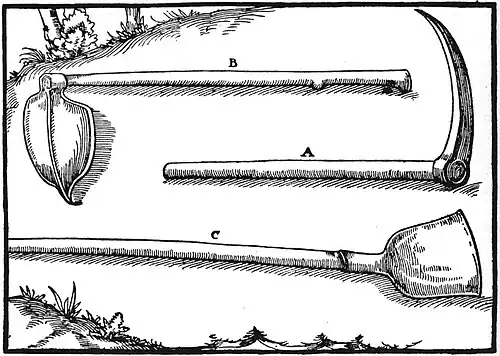 A—Round crowbar. B—Flat crowbar. C—Pike.