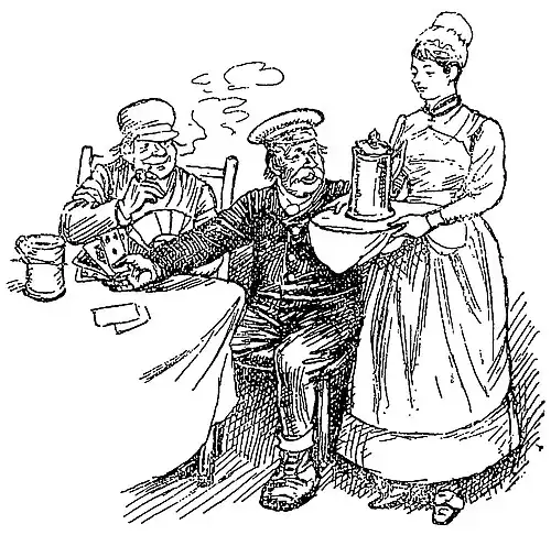 how she does talk! She talks without movement, without expression; her voice never varies, it flows on, and on, and on, like a great resistless river. Four young artisans come clamping along in their hob-nailed boots, and seating themselves at one of the rude wooden tables, call for beer.