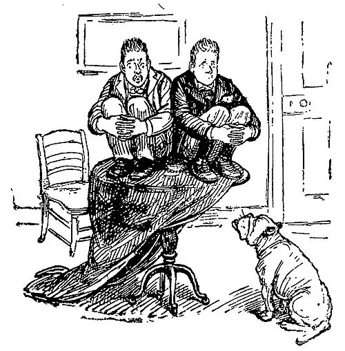 George, who at that time was modest and bashful, blushed and drew them up on to the chair. On the dog's displaying a desire to follow them, George moved up on to the table, and squatted there in the middle, nursing his knees.