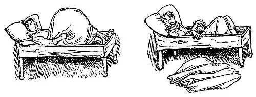 You cannot lean out of a German bed to pick up anything off the floor, owing to its box-like formation; so he has to scramble out after it, and of course every time he does this he barks both his shins twice against the sides of the bed.