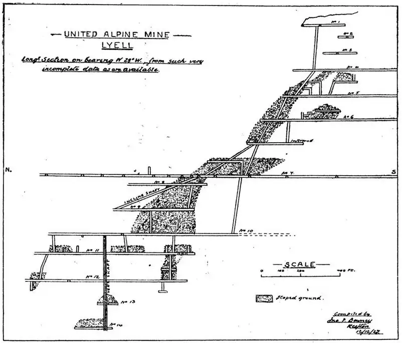 later the New Alpine Company extended a drive from the end of the most southerly of the crosscuts, which came to a point vertically under the spot where the block cut out, but no indication of reef was noted. It is to be regretted that more vigorous search was not made for the lost portion of this block, as its rediscovery would have given the mine a much longer and more profitable life.