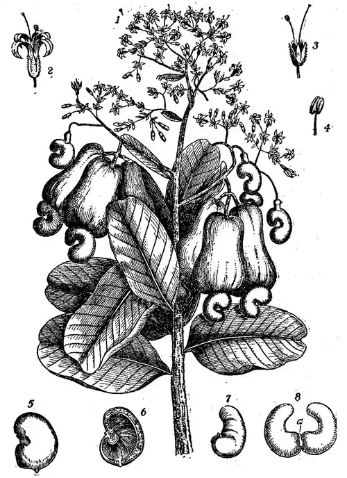 the name of cashew apple. By fermentation it yields an alcoholic beverage, from which a spirit for drinking is distilled in the West Indies and Brazil. The stem of the tree yields a gum analogous to gum arabic.