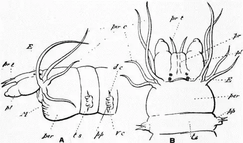 The Class as a Whole.—The Chaetopoda are with but few exceptions (Myzostomida in part, Sternaspis) elongated worms, flattened or, more usually, cylindrical, and bilaterally symmetrical. The body consists of a number of exactly similar or closely similar segments, which are never fused and metamorphosed, as in the Arthropoda, to form specialized regions of the body. It is, however, always possible to recognize a head, which consists at least of the peristomial segment with a forward projection of the same, the prostomium. A thorax also is sometimes to be distinguished from an abdomen. Where locomotive appendages (the parapodia of the Polychaeta) exist, they are never jointed, as always in the Arthropoda; nor are they modified anteriorly to form jaws, as in that group.