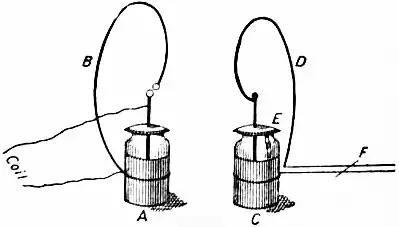 To produce the waves Hertz used two forms of vibrator. The first is represented in fig. 1. A and B are two zinc plates about 40 cm. square; to these brass rods, C, D, each about 30 cm. long, are soldered, terminating in brass balls E and F. To get good results it is necessary that these balls should be very brightly polished, and as they get roughened by the sparks which pass between them it is necessary to repolish them at short intervals; they should be shaded from light and from sparks, or other source of ultra-violet light. In order to excite the waves, C and D are connected to the two poles of an induction coil; sparks cross the air-gap which becomes a conductor, and the charges on the plates oscillate backwards and forwards like the charges on the coatings of a Leyden jar when it is short-circuited. The object of polishing the balls and screening off light is to get a sudden and sharp discharge; if the balls are rough there will be sharp points from which the charge will gradually leak, and the discharge will not be abrupt enough to start electrical vibrations, as these have an exceedingly short period. From the open form of this vibrator we should expect the radiation to be very large and the rate of decay of the amplitude very rapid. Bjerknes (Wied. Ann. 44, p. 74) found that the amplitude fell to 1/e of the original value, after a time 4T where T was the period of the electrical vibrations. Thus after a few vibrations the amplitude becomes inappreciable. To detect the waves produced by this vibrator Hertz used a piece of copper wire bent into a circle, the ends being furnished with two balls, or a ball and a point connected by a screw, so that the distance between them admitted of very fine adjustment. The radius of the them admitted of very fine adjustment. The radius of the circle for use with the vibrator just described was 35 cm., and was so chosen that the free period of the detector might be the same as that of the vibrator, and the effects in it increased by resonance. It is evident, however, that with a primary system as greatly damped as the vibrator used by Hertz, we could not expect very marked resonance effects, and as a matter of fact the accurate timing of vibrator and detector in this case is not very important. With electrical vibrators which can maintain a large number of vibrations, resonance effects are very striking, as is beautifully shown by the following experiment due to Lodge (Nature, 41, p. 368), whose researches have greatly advanced our knowledge of electric waves. A and C (fig. 2) are two Leyden jars, whose inner and outer coatings are connected by wires, B and D, bent so as to include a considerable area. There is an air-break in the circuit connecting the inside and outside of one of the jars, A, and electrical oscillations are started in A by joining the inside and outside with the terminals of a coil or electrical machine. The circuit in the jar C is provided