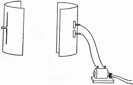 To illustrate the analogy between electric waves and waves of light Hertz found another form of apparatus more convenient. The vibrator consisted of two equal brass cylinders, 12 cm. long and 3 cm. in diameter, placed with their axes coincident, and in the focal line of a large zinc parabolic mirror about 2 m. high, with a focal length of 12.5 cm. The ends of the cylinders nearest each other, between which the sparks passed, were carefully polished. The detector, which was placed in the focal line of an equal parabolic mirror, consisted of two lengths of wire, each having a straight piece about 50 cm. long and a curved piece about 15 cm. long bent round at right angles so as to pass through the back of the mirror. The ends which came through the mirror were connected with a spark micrometer, the sparks being observed from behind the mirror. The mirrors are shown, in fig. 3.