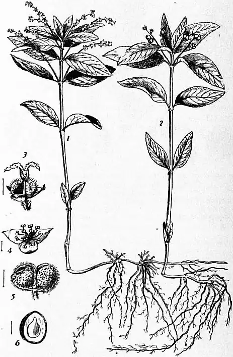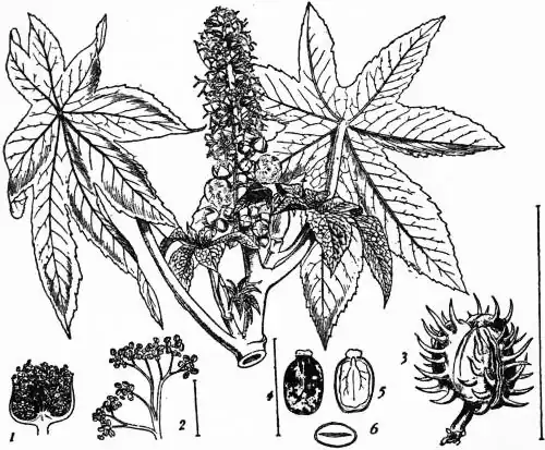 4. Male flower. 5. Fruit beginning to split open. 6. Seed cut lengthwise showing the embryo. |