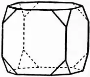 GALENA, an important ore of lead, consisting of lead sulphide (PbS). The mineral was mentioned by Pliny under this name, and it is sometimes now known as lead-glance (Ger. Bleiglanz). It crystallizes in the cubic system, and well-developed crystals are of common occurrence; the usual form is the cube or the cubo-octahedron (fig.). An important character, and one by which the mineral may always be recognized, is the perfect cubical cleavage, on which the lustre is brilliant and metallic. The colour of the mineral and of its streak is lead-grey; it is opaque; the hardness is 21/2 and the specific gravity 7.5. Twinned crystals are not common, but the presence of polysynthetic twinning is sometimes shown by fine striations running diagonally or obliquely across the cleavage surfaces. Large masses with a coarse or fine granular structure are of common occurrence; the fractured surfaces of such masses present a spangled appearance owing to the numerous bright cleavages.