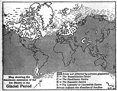 Evidences.—The evidence relied upon by geologists for the former existence of the great ice-sheets which traversed the northern regions of Europe and America is mainly of two kinds: (1) the peculiar erosion of the older rocks by ice and ice-borne stones, and (2) the nature and disposition of ice-borne rock débris. After having established the criteria by which the work of moving ice is to be recognized in regions of active glaciation, the task of identifying the results of earlier glaciation elsewhere has been carried on with unabated energy.