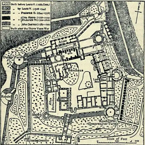 The chief attraction of Heidelberg is the castle, which overhangs the east part of the town. It stands on the Jettenbühl, a spur of the Königsstuhl (1800 ft.), at a height of 330 ft. above the Neckar. Though now a ruin, yet its extent, its magnificence, its beautiful situation and its interesting history render it by far the most noteworthy, as it certainly is the grandest and largest, of the old castles of Germany. The building was begun early in the 13th century. The elector palatine and German king Rupert III. (d. 1410) greatly improved it, and built the wing, Ruprechtsbau or Rupert’s building, that bears his name. Succeeding electors further extended and embellished it (see Architecture, Plate VII., figs. 78-80); notably Otto Henry “the Magnanimous” (d. 1559), who built the beautiful early Renaissance wing known as the Otto-Heinrichsbau (1556–1559); Frederick IV., for whom the fine late Renaissance wing called the Friedrichsbau was built (1601–1607); and Frederick V., the unfortunate “winter king” of Bohemia, who on the west side added the Elisabethenbau or Englischebau (1618), named after his wife, the daughter of James I. of Great Britain and ancestress of the present English reigning family. In 1648, at the peace of Westphalia, Heidelberg was given back to Frederick V.’s son, Charles Louis, who restored the castle to its former splendour. In 1688, during Louis XIV.’s invasion of the Palatinate, the castle was taken, after a long siege, by the French, who blew part of it up when they found they could not hope to hold it (March 2, 1689). In 1693 it was again captured by them and still further wrecked. Finally, in 1764, it was struck by lightning and reduced to its present ruinous condition.