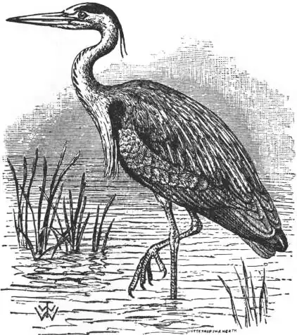 The common heron of Europe, Ardea cinerea of Linnaeus, is universally allowed to be the type of the family, and it may also be regarded as that of Professor Schlegel’s first section. The species inhabits suitable localities throughout the whole of Europe, Africa and Asia, reaching Japan, many of the islands of the Indian Archipelago and even Australia. Though by no means so numerous as formerly in Britain, it is still sufficiently common,[1] and there must be few persons who have not seen it rising slowly from some river-side or marshy flat, or passing overhead in its lofty and leisurely flight on its way to or from its daily haunts; while they are many who have been entertained by watching it as it sought its food, consisting chiefly of fishes (especially eels and flounders) and amphibians—though young birds and small mammals come not amiss—wading midleg in the shallows, swimming occasionally when out of its depth, or standing motionless to strike its prey with its formidable and sure beak. When sufficiently numerous the heron breeds in societies, known as heronries, which of old time were protected both by law and custom in nearly all European countries, on account of the sport their tenants afforded to the falconer. Of late years, partly owing to the withdrawal of the protection they had enjoyed, and still more, it would seem, from agricultural improvement, which, by draining meres, fens and marshes, has abolished the feeding-places of a great population of herons, many of the larger heronries have broken up—the birds composing them dispersing to neighbouring localities and forming smaller settlements, most of which are hardly to be dignified by the name of heronry, though commonly accounted such. Thus the number of so-called heronries in the United Kingdom, and especially in England and Wales, has become far greater than formerly, but no one can doubt that the number of herons has dwindled. The sites chosen by the heron for its nest vary greatly. It is generally built in the top of a lofty tree, but not unfrequently (and this seems to have been much more usual in former days) near or on the ground among rough vegetation, on an island in a lake, or again on a rocky cliff of the coast. It commonly consists of a huge mass of sticks, often the accumulation of years, lined with twigs, and in it are laid from four to six sea-green eggs. The young are clothed in soft flax-coloured down, and remain in the nest for a considerable time, therein differing remarkably from the “pipers” of the crane, which are able to run almost as soon as they are hatched. The first feathers assumed by young herons in a general way resemble those of the adult, but the pure white breast, the black throat-streaks and especially the long pendent plumes, which characterize only the very old birds, and are most beautiful in the cocks, are subsequently acquired. The heron measures about 3 ft. from the bill to the tail, and the expanse of its wings is sometimes not less than 6 ft., yet it weighs only between 3 and 4 ℔.