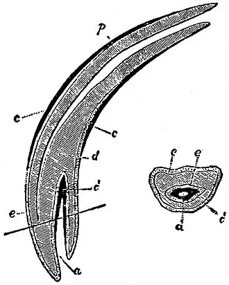 | c′, | Inner layer of cementum, lining a, the pit or cavity of the crown of the tooth.