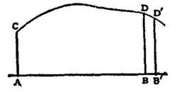 6. The chief of these rules is obtained by regarding the extreme ordinate BD as variable. Let ξ now denote the abscissa of B. The area A of the figure ACDB is represented by the integral , and it is a function of ξ. Let BD be displaced to B′D′ so that becomes (seeTheorem of Inversion. fig. 4). The area of the figure ACD′B′ is represented by the integral and the increment ΔA is given by the formula: