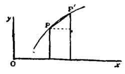 4. In the problem of tangents the new process may be described as follows. Let P, P′ be two points of a curve (see fig. 2). Let x, y be the coordinates of P, and x+Δx, y+Δy those of P′. The symbol Δx means “the difference of two x’s” and there is a like meaning for the symbol Δy.Differentiation.