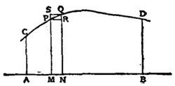5. The problem of quadratures leads to a type of limiting process which may be described as follows: Let y=ƒx be the equation of a curve, and let AC and BD be the ordinates of the points C and D (see fig. 3). Let a, b be the abscissae of these points. Let the segment AB be divided into a numberIntegration. of segments by means of intermediate points such as M, and let MN be one such segment. Let PM and QN be those ordinates of the curve which have M and N as their feet. On MN as base describe