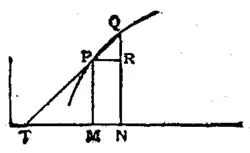 Fermat’s method for solving the problem of tangents may be explained as follows:—Let (x, y) be the coordinates of a point P of a curve, (x′, y′), those of a neighbouring point P′ on the tangent at P, and let MM′ = E (fig. 6).