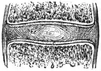 Movable joints, or diarthroses, are divided into those in which there is much and little movement. When there is little movement the term half-joint or amphiarthrosis is used. The simplest kind of amphiarthrosis is that in which two bones are connected by bundles of fibrous tissue which pass at right angles from the one to the other; such a joint only differs from a suture in the fact that the intervening fibrous tissue is more plentiful and is organized into definite bundles, to which the name of interosseous ligaments is given, and also that it does not synostose when growth stops. A joint of this kind is called a syndesmosis, though probably the distinction is a very arbitrary one, and depends upon the amount of movement which is brought about by the muscles on the two bones. As an instance of this the inferior tibio-fibular joint of mammals may be cited. In man this is an excellent example of a syndesmosis, and there is only a slight play between the two bones. In the mouse there is no movement, and the two bones form a synchondrosis between them which speedily becomes a synostosis, while in many Marsupials there is free mobility between the tibia and fibula, and a definite synovial cavity is established. The other variety of amphiarthrosis or half-joint is the symphysis, which differs from the syndesmosis in having both bony surfaces lined with cartilage and between the two cartilages a layer of fibro-cartilage, the centre of which often softens and forms a small synovial cavity. Examples of this are the symphysis pubis, the mesosternal joint, and the joints between the bodies of the vertebrae (fig. 3).