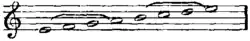 the octave scale attributed to Pythagoras, was admitted, to preserve the time-honoured seven strings one note had to be omitted; it was therefore customary to omit the C, which in Greek practice was a dissonance. The Greek names for the strings of seven and eight stringed lyres, the first note being highest in pitch and nearest the player, were as follows: Nete, Paranete, Paramese; Mese, Lichanos, Parhypate, Hypate; or Nete, Paranete, Trite, Paramese; Mese, Lichanos, Parhypate, Hypate—the last four from Mese to Hypate being the finger tetrachord, the others touched with the plectrum. The highest string in pitch was called the last, νεάτη; the lowest in pitch was called the highest, ὑπάτη, because it was, in theory at least, the longest string. The keynote and thumb string was μέση, middle; the next lower was λίχανος, the first finger or lick-finger string; τρίτη, the third, being in the plectrum division, was also known as ὀξεῖα, sharp, perhaps from the dissonant quality to which we have referred as the cause of its omission. The plectrum and finger tetrachords together were διαπασῶν, through all; in the disjunct scale, an octave.