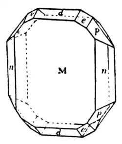cleavages parallel to the macropinacoid (M in the fig.) and the brachypinacoid. The hardness is 63/4; and the sp. gr. 3·27-3·37,