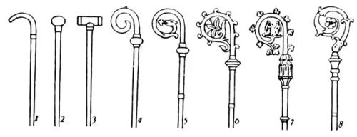 As regards the development of the form of the pastoral staff, there are four principal types: (1) staves with a simple crook, the oldest form, which survived in Ireland until the 12th century; (2) staves with a ball or knob at the top, a rare form which did not long survive as a pastoral staff; (3) staves with a horizontal crook, so-called Tau-staves, used especially by abbots and surviving until the 13th century; (4) staves with crook bent inwards. These last already appear in miniatures of the 9th century; from the 11th onwards they predominated; and in the 13th century they ousted all other forms. Originally plain, the crook was from the 11th century onwards often made in the form of a snake (5), which in richer staves encircled the Lamb of God or the representation of a figure. Since the 13th century the snake, under Gothic influence, developed into a boldly designed tendril set with leaves, which usually encircled a figure or group of figures, and the knob dividing shaft and crook into an elegant chapel (6 and 7). Finally, at the close of the middle ages, the lower part of the crook was bent outwards so that the actual volute came over the middle of the knob, the type that remained dominant from that time onwards (8). As a decoration, rather than for practical reasons, a fine folded cloth (pannisellus, sudarium, velum, Eng. veil), was from the 14th century onward often suspended from the knob of the pastoral staff. This was done both in the case of bishops' and of abbots' staves, but is now confined to the latter (Cerem. episc. i. 11, 5; Decr. Alex. VII. 27 Sept. 1659; Sacr. Congr. Rit. 27 Sept. 1847).