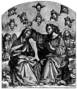 The transition in Raphael's style from his first or Perugian to his second or Florentine manner is well shown in the large picture of the Coronation of the Virgin painted for Maddalena degli Oddi, now in the Vatican, one of the most beautiful that he ever produced, and especially remarkable for its strong religious sentiment - in this respect a great contrast to the paintings of his last or Roman manner which hang near it. The exquisite grace of the angel musicians and the beauty of the faces show signs of his short visit to Florence, while the general formality of the composition and certain details, such as the fluttering ribands of the angels, recall peculiarities of Perugino and of Pinturicchio, with whose fine picture of the same subject hung close by it is interesting to compare it. Raphael's painting, though by far the more beautiful of the two, is yet inferior to that of Pinturicchio in the composition of the whole; an awkward horizontal line divides the upper group of the Coronation from that below, the apostles standing round the Virgin's tomb, filled with roses and lilies (Dante, Par. xxiii. 73), while the older Perugian has skilfully united the two groups by a less formal arrangement of the figures. The predella of this masterpiece of Raphael is also in the Vatican; some of its small paintings, especially that of the