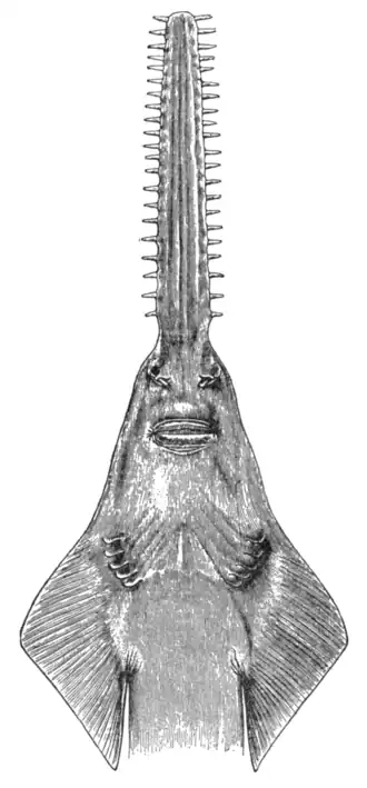 The first family, Pristidae, contains only the saw-fishes (Pristis), of which five species are known, from tropical and sub-tropical seas. They frequent especially estuaries and river-mouths, and in some cases make their way over a hundred miles from the sea. Although saw-fishes possess all the essential characteristics of the rays proper, they retain the elongate form of the body of sharks, the tail being excessively muscular and the sole organ of locomotion. The “saw” (fig. 1) is a flat prolongation of the snout, with an endoskeleton which consists of three to five cartilaginous tubes; these are the rostral processes of the cranial cartilage and are found in all rays, though commonly much shorter. The integument of the saw is hard,