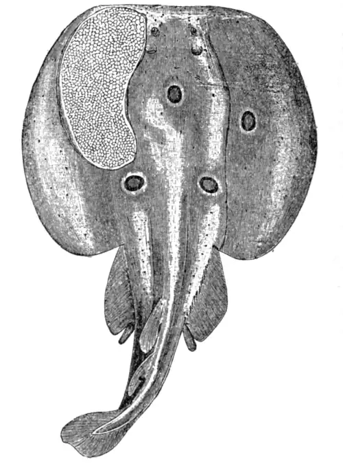 Fig. 2.—Torpedo narce (Mediterranean). A portion of the skin on the left side has been removed to show the electric organ.