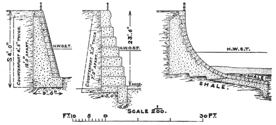 surmounted by a dressed cornice and coping; the length is 340 yards. The work was constructed, in 1888, at a cost of £10,000, or £29, 8s. per lineal yard.