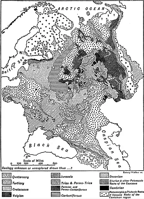 Cretaceous beds—sands, loose sandstones, marls and white chalk—occupy nearly the whole of the region S. of a line drawn from the Niemen to the upper Oka and Don, and thence N.E. to Simbirsk. Over a large part of this area, however, they are concealed by the later Tertiary deposits, and they are absent over the Dnieper and Don ridge in the Yaila Mountains and in the higher parts of the Caucasus. They are rich in grinding stone, and in phosphatic deposits.