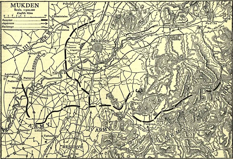 Both sides stood fast in the old positions up to the verge of the last and greatest battle. Kuropatkin was reinforced, and appointed Kaulbars to succeed Grippenberg and Bilderling to the command of the 3rd Army vacated by Kaulbars. On the other hand, Nogi's 3rd Army, released by the fall of Port Arthur, was brought up on the Japanese left, and a new army under Kawamura (5th), formed of one of the Port Arthur and two reserve divisions, was working from the upper Yalu through the mountains towards the Russian left rear. The Russian line in front of Mukden from the Hun-ho, through the Putilov and Novgorod hills on the Sha-ho, to the mountains, was 47 m. long, the armies from right to left being II. (Kaulbars), III. (Bilderling) and I. (Linievich); a general reserve was at Mukden. On the other side from left to right, on a line 40 m. long, were Oku (2nd Army), Nozu (4th), Kuroki (1st) and Kawamura (5th), the general reserve in rear of the centre at Yentai and the 3rd Army in rear of Oku. Each side had about 310,000 men present. The entire front of both armies was heavily entrenched. The Russians had another offensive in contemplation when the Japanese forestalled them by advancing on the 21st of February. The 5th Army gradually drove in Kuropatkin's Mukden. small, detachments in the mountains, and came up in line with Kuroki, threatening to envelop the Russian left. The events on this side and misleading information induced Kuropatkin to pay particular attention to his left. The Japanese 1st and 5th Armies were now engaged (25th February), and elsewhere all was quiet. But on the 27th the fighting spread to the centre, and Nogi (originally behind Oku) was on the march to envelop the Russian right. He was held under observation throughout by Russian cavalry, but it seems that little attention was paid to their reports by Kuropatkin, who was still occupied with Kuroki and Kawamura, and even denuded his right of its reserves to reinforce his left. With a battle-front exceeding two days' marches the wrong distribution of reserves by both sides was a grave misfortune. Kuropatkin was are last convinced, on the 28th of February, of the danger from the west, and did all in his power to form a solid line of defence on the west side of Mukden. Nogi's first attack (1st-2nd March) had not much success, and a heavy counter stroke was delivered on the 2nd. Fighting for localities and alterations in the interior distribution of the opposing forces occupied much time, and by the 3rd, though the battle had become severe, Kuropatkin had merely drawn in his right and right centre (now facing W. and S.W. respectively) a little nearer Mukden. His centre on the Sha-ho held firm, Kuroki and Kawamura made but slight progress against his left in the mountains. Nogi and Oyama were equally impressed with the strength of the new (west) Russian front, and like Grant at Petersburg in 1864, extended farther and farther to the outer flank, the Russians following suit. The Japanese marshal now sent up his army reserve, which had been kept far to the rear at Yentai, to help Nogi. It was not before the evening of the 6th of March that it came up with the 3rd Army and was placed in position opposite the centre of the Russian west front. On