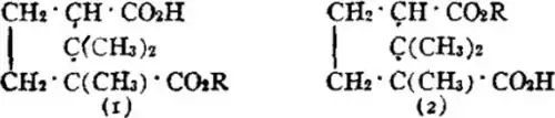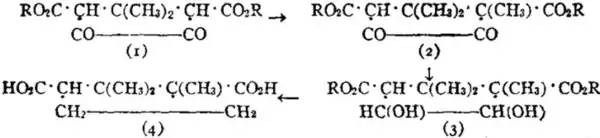 a conclusion confirmed by its synthesis (see below). The Bredt formula is also supported by the synthesis of r-camphoric acid by G. Komppa (Ber., 1901, 34, p. 2472; 1903, 36, p. 4332). In this synthesis ethyl oxalate is condensed with ββ-dimethyl glutaric ester, and the resulting diketoapocamphoric ester (1) is then methylated to diketocamphoric ester (2). The keto groups in (2) are converted in CH2 groups as follows:—Sodium amalgam converts this ester into dioxycamphoric ester (3), which with hydriodic acid and phosphorus yields r-dihydrocamphoric acid. At 125° C. this compound combines with hydrobromic acid to form β-bromcamphoric acid, which on reduction with zinc and acetic acid yields r-camphoric acid (4):—