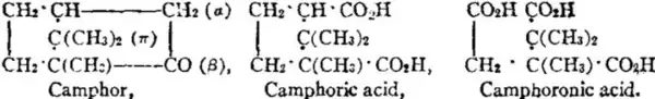 A vast amount of work has been done on the constitution of the camphor molecule. The earlier investigations on the ready formation of benzene derivatives by the breaking down of camphor led to the view that the molecule was a simple six-membered carbon ring. Subsequent research, however, showed that the formula proposed by J. Bredt (Ber., 1893, 26, p. 3047), in which camphor is to be regarded as a bicyclo-heptane derivative, is correct. This formula is based on the fact that camphoronic acid yields trimethylsuccinic, isobutyric, and carbonic acids, and carbon on dry distillation, and Bredt suggested that it was an ααβ-trimethylcarballylic acid,