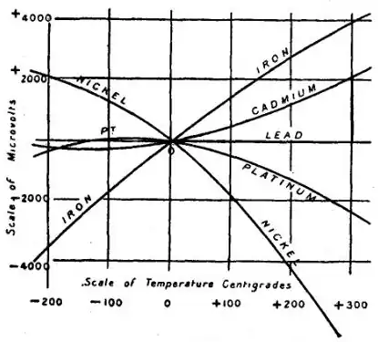 21. Potential Diagrams on Convection Theory.—The difference between the two theories is most readily appreciated by drawing the potential diagrams corresponding to the supposed locations of the E.M.F. in each case. The contact theory has been already illustrated in fig. 4. Corresponding diagrams for the same metals on the convection theory are given in fig. 5. In this diagram the metals are supposed to be all joined together and to be at the same time potential at the cold junction at 0° C. The ordinate of the curve at any temperature is the difference of potential between any point in the metal and a point in lead at the same temperature. Since there is no contact E.M.F. on this theory, the ordinates also represent the E.M.F. of a thermocouple metal-lead