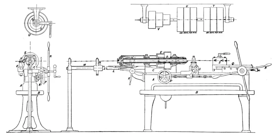 in due succession, each one doing its little share of work, until the cycle of operations required to produce the object is complete, the cycle including such operations as turning and screwing, roughing and finishing cuts, drilling and boring. Severance of the finished piece is generally done by a tool or tools held by a cross-slide between the headstock and turret, so termed because its movements take place at right angles with the axis of the machine. This also often performs the duty of "forming," by which is meant the shaping of the exterior portion of an object of irregular outline, by a tool the edge of which is an exact counterpart of the profile required. The exterior of a cycle hub is shaped thus as also are numerous handles and other objects involving various curves and shoulders, &c. The tool is fed perpendicularly to the axis of thi rotating work and completes outlines at once; if this were one in ordinary lathes much tedious manipulation of separate tools would be involved.