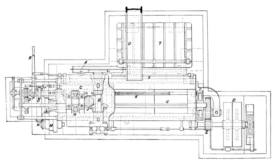R, Handle for operating clutch P, which thus gives slow feed when clutch is in mesh with O, and quick return when engaging with P.