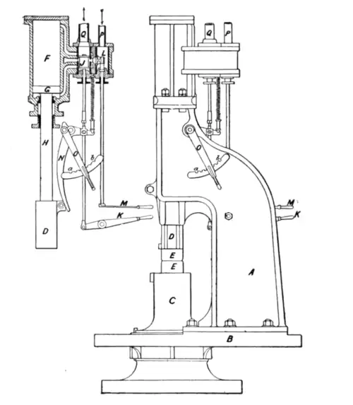 E, Pallets, or forging blocks, attached to anvil and tup. F, Steam cylinder.