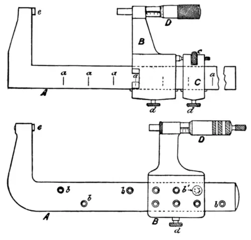A, Pratt & Whitney gauge. a, Tube split at ends; b, b, chucks clamping tube on pain rod c, and screwed end d. Rough adjustment is made on rod c, of which several are provided; fine adjustment is by screwed end d.