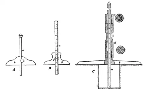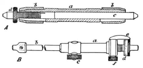 B, Sawyer gauge. a, Body; b, extension rods for rough adjustment, several being supplied and pinched with screw c; d, screwed end with graduated head; e, reading arm extending from body over graduations; f, clamping screw.