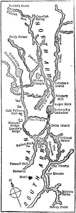 In the Pillared Palace a number of large alabaster shafts had been thrown down and fragments carried away. Near by were so-called “bear-wallows,” which proved to be the remains of an aboriginal workshop, where masses of flint were broken into rectangular blocks; and spalls and flint-chips encumber the floor and choke the passage-way. Milroy's Temple is a magnificent room, 100 by 150 ft. in its dimensions. It contains many remarkable formations; and its display of helictites, or twisted stalactites, is unsurpassed.